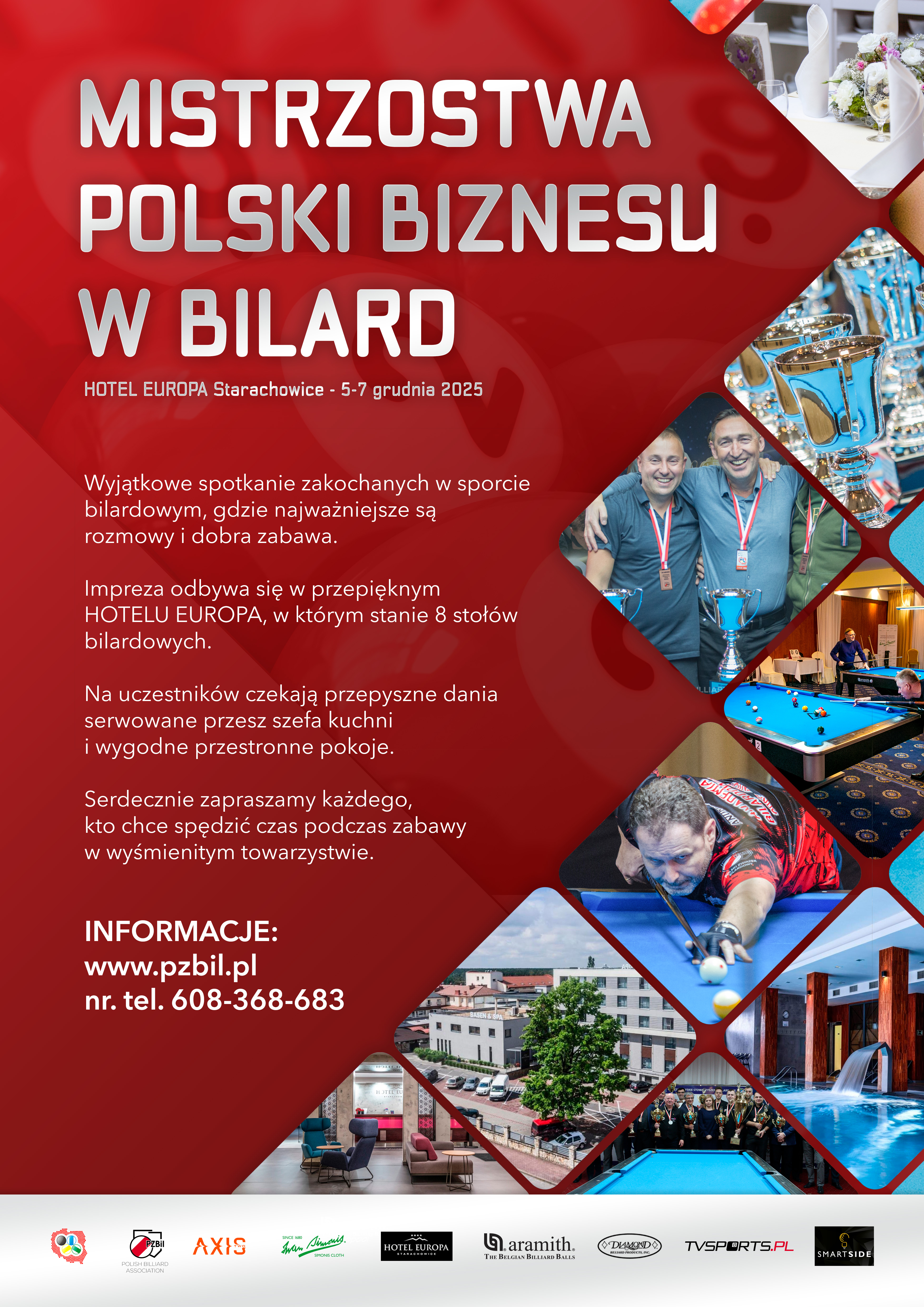 W dniach 5-7 grudnia w hotelu EUROPA w Starachowicach odbędą się Mistrzostwa Polski Biznesu w Bilard. Przypomnimy, że zawody gościły już w Starachowicach w 2010 roku, a tytuły mistrzowskie zdobyli wówczas Robert Biliński, Grzegorz Nowak oraz para Krzysztof Doroszkiewicz – Jacek Borys.
