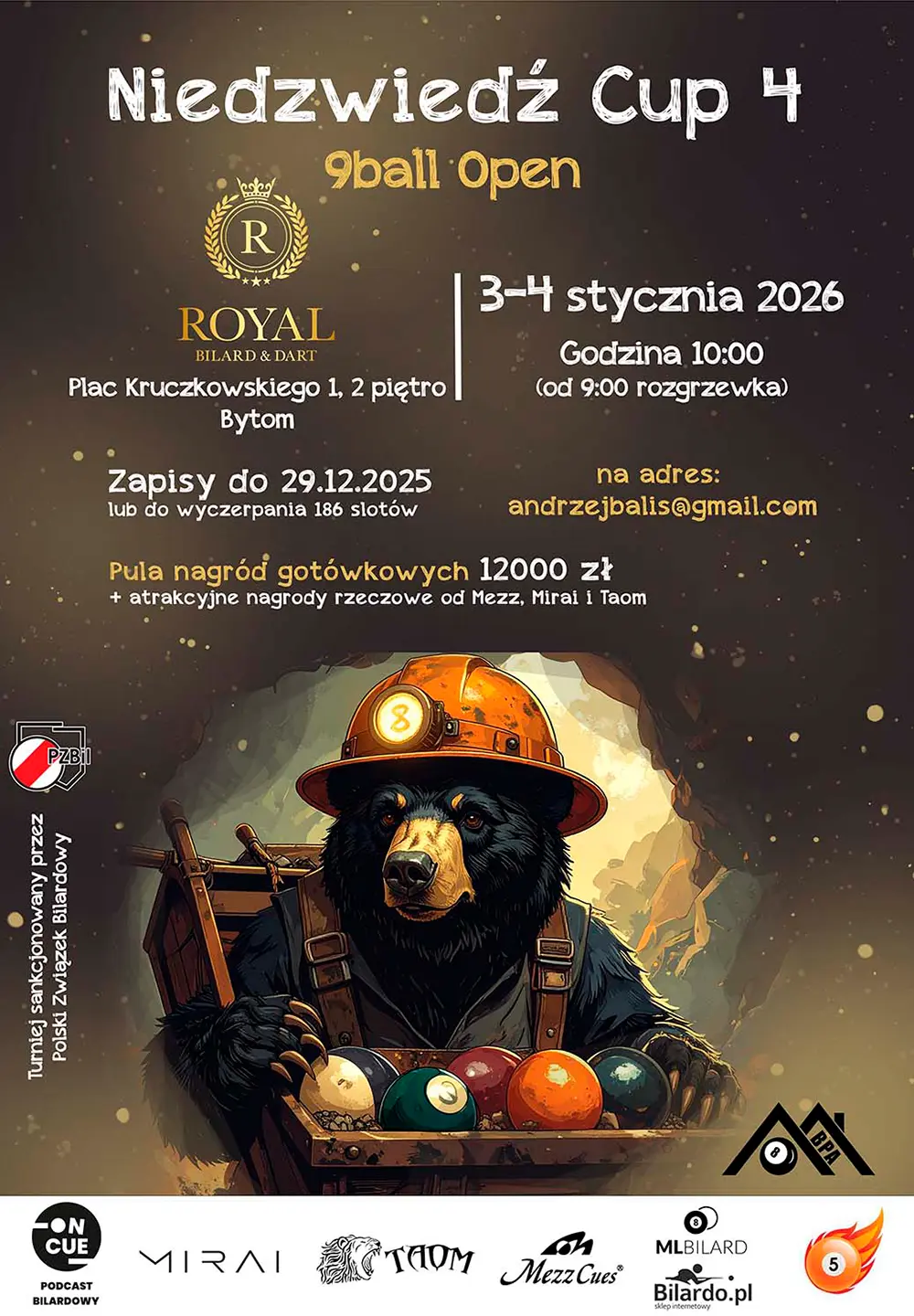 W dniach 3-4 stycznia 2026, w klubie Royal Bytom, odbędzie się czwarta edycja bilardowego turnieju Niedźwiedź Cup. Pula nagród wyniesie 12.000zł + nagrody od MIRAI, MEZZ i TAOM.