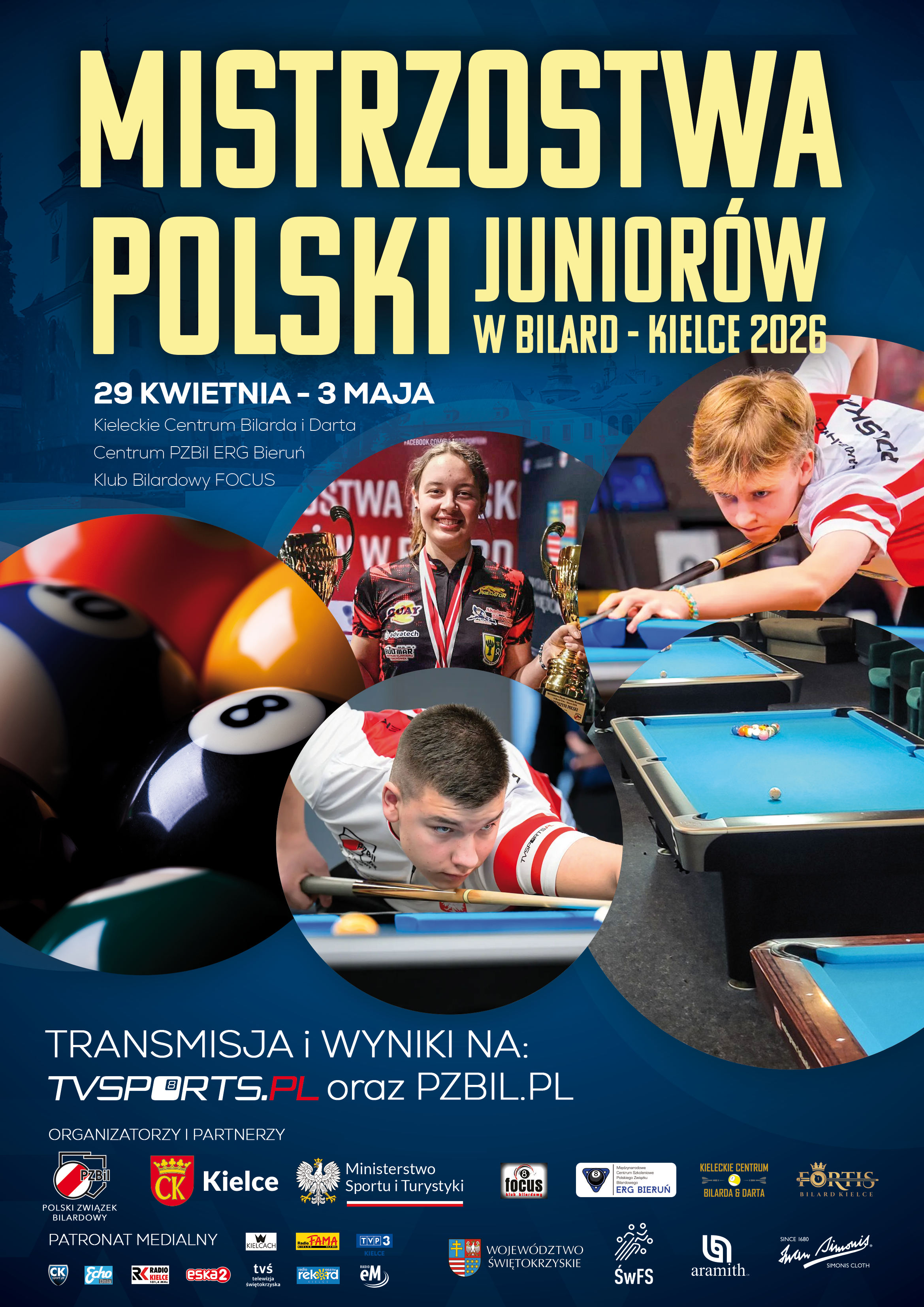 W dniach 29 kwietnia - 3 maja w Kielcach odbędą się finały Mistrzostw Polski Juniorów w Bilard - Kielce 2026. Do stolicy województwa świętokrzyskiego przyjedzie ponad 100 zawodników i zawodniczek z trenerami z kilkudziesięciu klubów całej Polski. Przez pięć dni walczyć będą o medale, punkty SWS oraz kwalifikację do kadry narodowej oraz Euro . Przy stole zobaczymy mistrza świata, mistrzów Europy i cała krajową czołówkę młodych bilardzistów. Zawody będzie można śledzić na żywo na tvsports.pl oraz stronach PZBil. Partnerami imprezy wspierającymi ich organizacje są Urząd Miasta Kielce, Urząd Marszałkowski Województwa Świętokrzyskiego, Świętokrzyska Federacja Sportu w Kielcach, Fortis Bilard Kielce który organizuje zawody wspólnie z Polskim Związkiem Bilardowym. Początek gier w środę a uroczyste otwarcie w czwartek o 9.45.