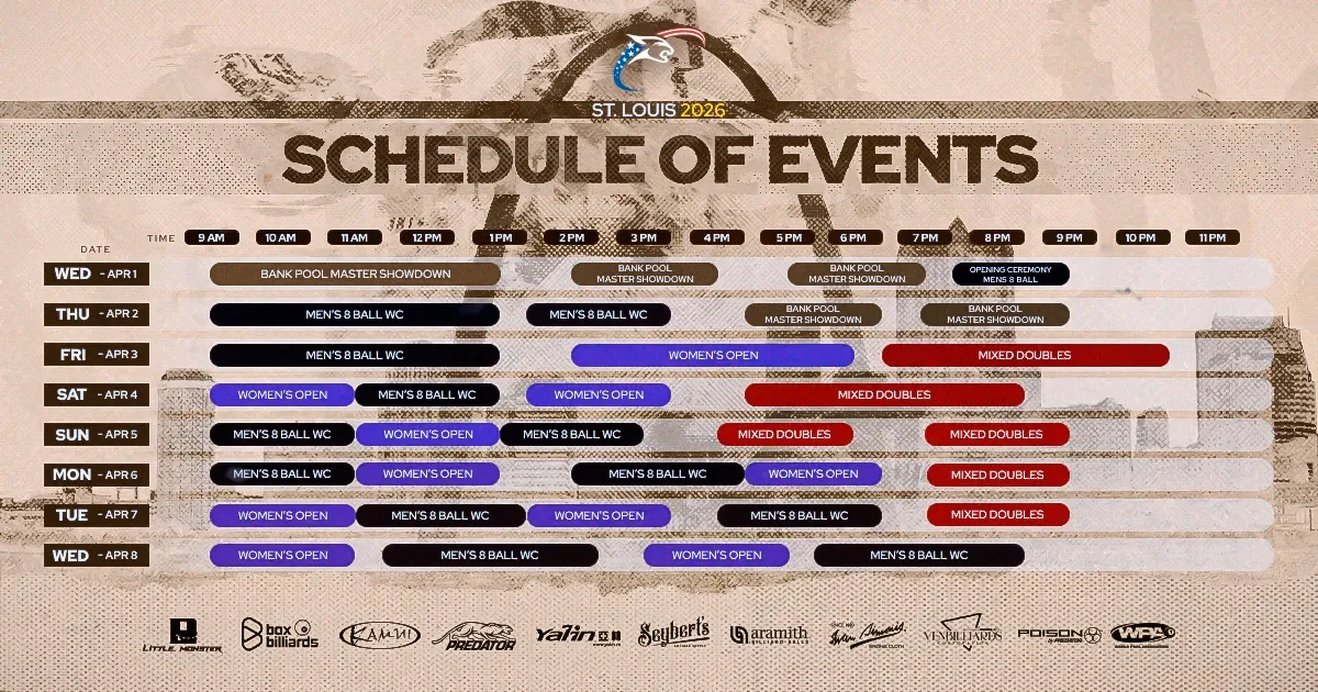 W St. Louis rozegrane zostaną jeszcze: WPA Predator Women's Open, Mixed Doubles oraz Bank Pool Masters Showdown. Pełny plan gier poniżej.